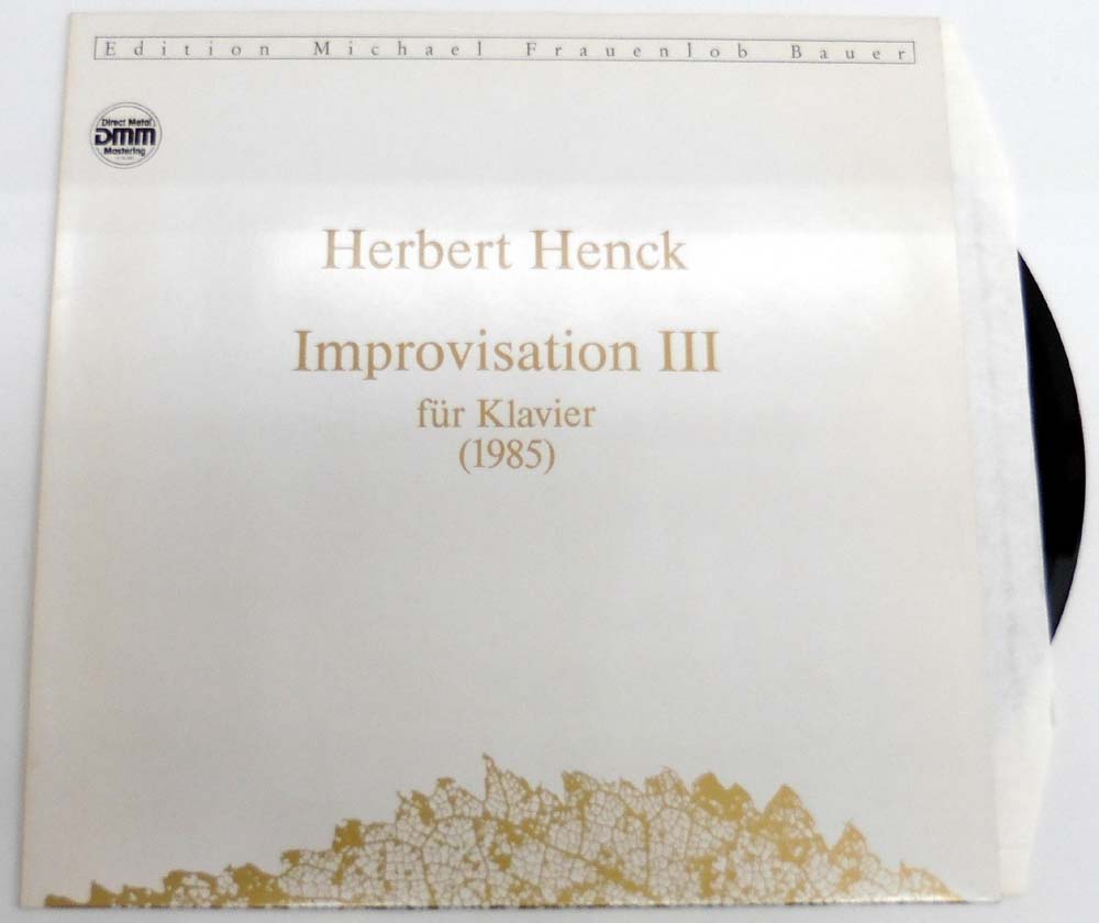 Henck, Herbert: Improvisationen III für Klavier (1985). [Schallplatte / Vinyl Record]. Edition Michael F. Bauer. 1987. 31,5 x 31,5 cm. Schallplatte. OKarton. Sehr gutes Exemplar (Near Mint). Edition Michael Frauenlob Bauer – MFB 007.
