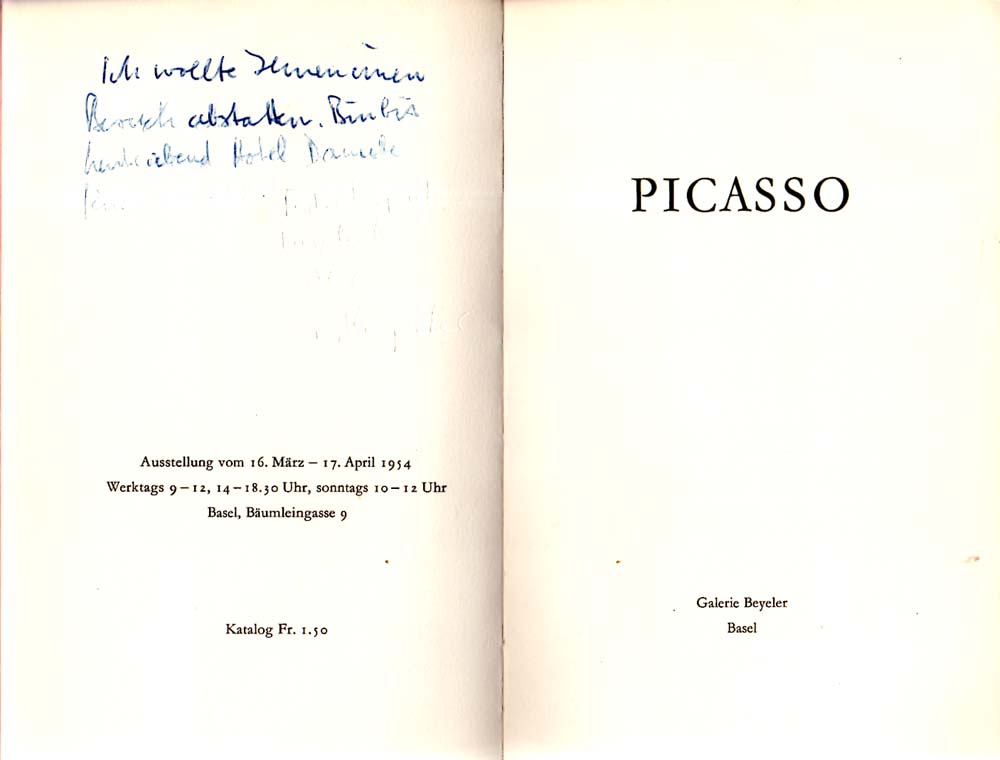 Picasso, Pablo: Galerie Beyeler, Basel, 16. März-17. April 1954. 1. Auflage. Basel. Galerie Beyeler. 1954. 18 x 12 cm. 44 unpaginierte S. OKarton mit montierter Illustration, transparenter Pergaminumschlag.. Der transparente Umschlag Randberieben, sonst gutes Exemplar. Der Katalog diente als Benachrichtigungsträger für eine Nachricht von Ernst Beyeler an Max Ernst (dieser nicht namentlich erwähnt): „Ich wollte Ihnen einen Besuch abstatten. Bin bis heute abend Hotel Danube Rue Jacob 52. Feder kaputt, herzlich Ihr E. Beyeler“ (da die Feder kaputt ging, ist das Ende der Nachricht n das Papier gekratzt). Beyeler wollte sich mit Max Ernst treffen und hinterließ ihm auf diese Weise eine Nachricht. Mit einem Text von Kurt Kusenberg sowie mit 22 abgebildeten Arbeiten in Schwarz-Weiß. [Exemplar aus der Bibliothek von Max Ernst].