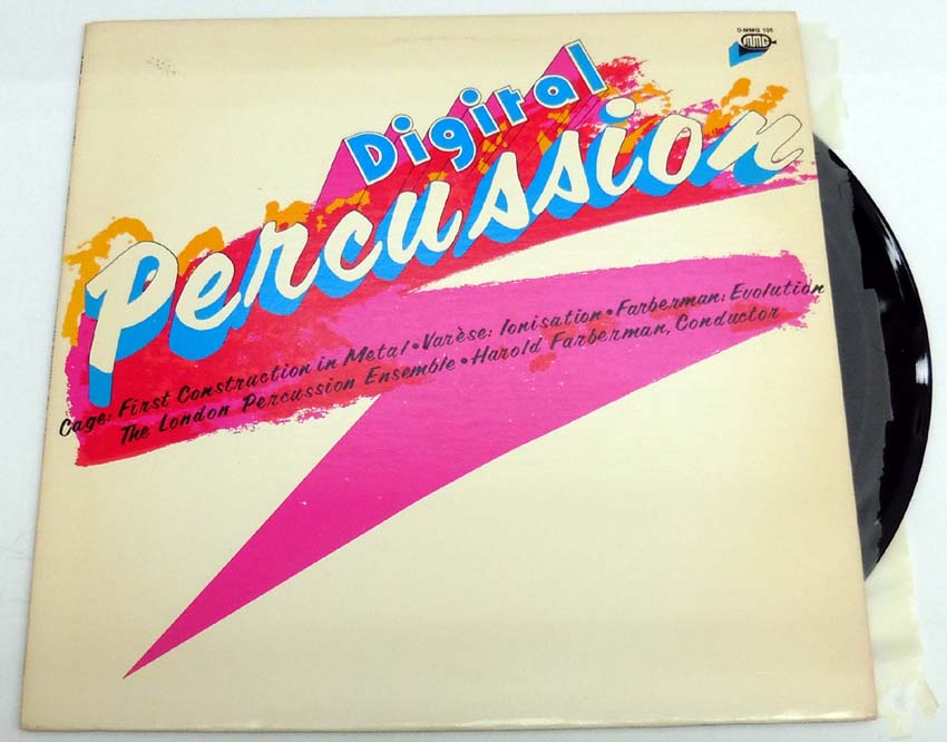 Digital Percussion. CAGE: First Construnction in Metal • VARESE: Ionisation • FARBERMAN: Evolution. [Schallplatte / Vinyl Record]. New York. The Moss Music Group. 1981. 31,5 x 31,5 cm. OVinyl-Schallplatte, OKunststoff-Innenhülle. OKarton-Cover. Cover nachgedunkelt sowie mit kleinem Besitzaufkleber am Backcover, Kunststoff-Innenhülle im Begriff zu zerfallen (Very Good); Schallplatte in sehr gutem Zustand (Near Mint). Insgesamt gutes Exemplar. The Moss Music Group – D-MMG 105.