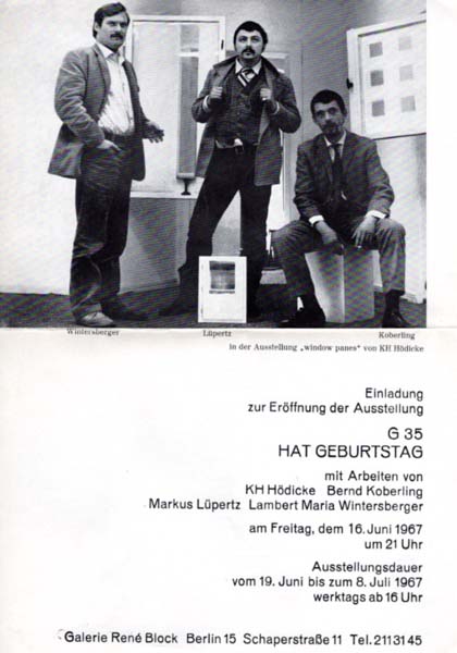 Hödicke, KH / Koberling, Bernd / Lüpertz, Markus / Wintersberger, Lambert Maria: Einladung zur Eröffnung der Ausstellung G 35 HAT GEBURTSTAG. mit Arbeiten von KH Hödicke. Bernd Koberling. Markus Lüpertz. Lambert Maria Wintersberger am Freitag, dem 16. Juni 1967 um 21 Uhr. Berlin. Galerie René Block. 1967. 30 x 21 cm. 1 Blatt. Papierbedingt gebräunt und minimalst angestaubr, sonst noch sehr gutes Exemplar. Einladungsklappkarte der Galerie René Block in Berlin anläßlich der Ausstellung „G 35 HAT GEBURTSTAG“ mit KH Hödicke, Bernd Koberling, Markus Lüpertz und Lambert Maria Wintersberger. Innen eine schwarzweisse Abbildung nach einer Porträt-Fotografie von Wintersberger, Lüpertz und Koberling in der Ausstellung „window panes“ von Hödicke in situ. Mit einem Text von Martin Glaser (″Das Großgörschen-Märchen“) auf der Rückseite.