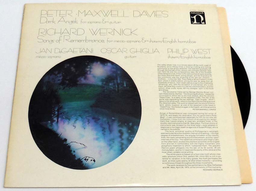 Davies, Peter Maxwell / Richard Wernick: Dark Angels / Songs Of Remembrance. [Schallplatte / Vinyl Record]. New York. Nonesuch Records. 1977. 31,5 x 31,5 cm. OSchallplatte. OKarton-Cover. Cover etwas nachgedunkelt und mit kleinem Besitzaufkleber am Backcover (Very Good+), Schallplatten in sehr gutem Zustand (Near Mint). Insgesamt gutes Exemplar. Nonesuch – H-71342.