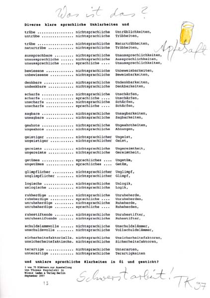 Kapielski, Thomas: Diverse klare sprachliche Unklarheiten und / und unklare sprachliche Klarheiten in Öl und gestickt? 1 von 75 Blättern zur Ausstellung von Thomas Kapielsky in Wiens Laden & Verlag Berlin. September 1997. Erste Auflage. Berlin. Wiens Laden & Verlag. 1997. 42,1 x 29,6 cm. 1 Blatt. Verso minimlalst fingerfleckig, sonst sehr gutes Exemplar. Plakatarbeit in schwarzweißen Offsetdruck, auf leichtem Karton, des deutschen Schriftstellers und bildenden Künstlers Thomas Kapielski (*1951) zu einer Ausstellung in Wiens Laden & Verlag im September 1997 mit einer gedruckten Textarbeit im Stil der konkreten Poesie. Eines von 75 Blättern zur Ausstellung von Kapielski, hier Exemplar Nr. 13. Vom Künstler eigenhändig handschriftlich (in Bleistift) durch die Ergänzungen „Was ist das?“, „Apfelsaft“ und „Schwerstarbeit!“ sowie einem Signaturmonogramm „TK“ nebst Datum „97“ sowie einer winzigen, mit gelbem Faserschreiber kolorierten Kritzelzeichnung eines Glases Apfelsaft (im Sinne des Textes) erweitert.