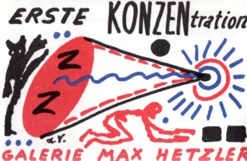 Penck, A. R. [d. i. Ralf Winkler]: „erste konzentration“. Drei Portfolios mit je 12 Blättern von 6 Künstlern in den grafischen Techniken: Holzschnitt, Linolschnitt, Lithografie, Radierung und Siebdruck. Max-Ulrich Hetzler GmbH. Schwabstraße 2. 7000 Stuttgart 1. Einladung zur Eröffnung am Freitag, dem 3. September 1982 von 20 bis 22 Uhr. Dauer der Ausstellung bis 30. September 1982. Stuttgart. Max-Ulrich Hetzler GmbH. 1982. 11 x 16,8 cm. [1] unpaginiertes Blatt. Kanten minimalst angestaucht, sonst noch sehr gutes Exemplar. Einladungskarte der Galerie Max Hetzler in Stuttgart zu einer Ausstellung A. R. Pencks im Jahre 1982. Recto eine dreifarbige Abbildung nach einer Arbeit Pencks zur Ausstellung.