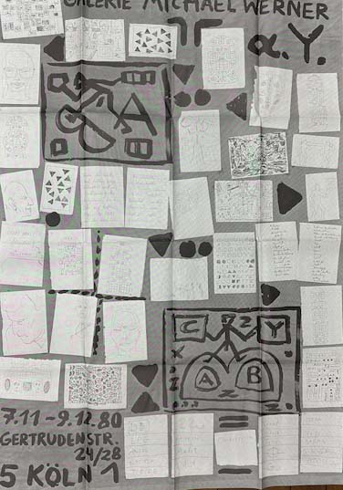 Penck, A. R. [d. i. Ralf Winkler]: Verwandlung eines DDR-Bürgers in einen BRD Bürger. Galerie Michael Werner. 7.11. – 9.12.80. Gertrudenstr. 24/28. 5 Köln 1. Köln. Galerie Michael Werner. 1980. 119 x 83,3 cm. [1] unpaginiertes Blatt. Sehr gutes Exemplar. Zweiseitiges Plakat auf leichtem Papier der Galerie Michael Werner in Köln zu einer Ausstellung A. R. Pencks im Jahre 1980. Recto eine schwarzweiße Abbildung von zahlreichen Zeichnungen Pencks, die vom Künstler in den inhaltlichen Zusammenhang mit der Arbeit „Verwandlung eines DDR-Bürgers in einen BRD Bürger“ nebst Überarbeitungen gestellt wurde. Verso weitere Abbildungen von Papierarbeiten Pencks nebst den Angaben zur Galerie.