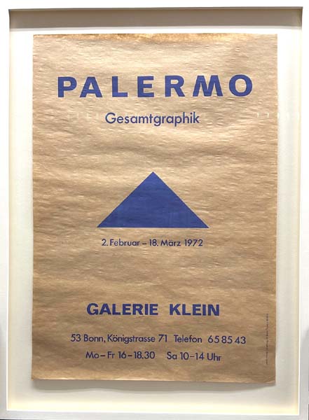 Palermo, Blinky: Gesamtgraphik. Galerie Klein, 2. Februar – 18. März 1972. Bonn. Galerie Klein. 1972. 57 x 40 cm. 1 Blatt. Sehr gutes Exemplar. Typographisch gestaltetes Plakat in Offsetdruck, Blau auf braunem Packpapier, gerahmt in Mattweiß geschlemmtem Naturholzrahmen unter entspiegeltem Glas, schwebend fixiert auf cremeweißem Passepartoutkarton (68,5 x 50,6 cm]. Plakat zur ersten Ausstellung Palermos in der Galerie Klein. Das auf dem Plakat wiedergegebene ikonische blaue Dreieck befand sich bis zur Schließung der Galerie in der Bonner Südstadt und dem Umzug in die Eifel über der Türe, die vom Flur zu den Ausstellungsräumen im Erdgeschoß führte. Dort hatte es Blinky Palermo im Februar 1972 selber angebracht. Das „blaue Dreieck“ war das Motiv der ersten ausgeführten Grafik Palermos von 1966, wo es auch erstmals für ein Plakat der Galerie Friedrich + Dahlem in München benutzt wurde. 1969 gab Rene Block dann die legendäre Edition des Dreiecks heraus. Vorgesehen war ein von jeweils eigener Hand des Käufers mittels Schablone über einem Türrahmen ausgeführtes blaues Dreieck. Das Plakat ist, wie auch das der Galerie Friedrich + Dahlem, heute augesprochen selten. [Vgl. „Kleines blaues Dreieck“, in: APEX. Sonderheft Galerie Klein, Nr. 16, S., Erhard Klein Vollkonzentriert. Galerie Klein 1970-2006“ in: sediment Heft 13, S. 29-30 und 79 mit Abbildung des Plakats; Erhard Klein bestätigt, dass das Plakat in Offset gedruckt wurde].