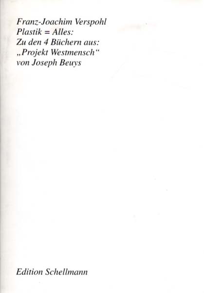 Beuys, Joseph – Franz-Joachim Verspohl: Plastik = Alles: Zu den 4 Büchern aus „Projekt Westmensch“ von Joseph Beuys. Erste Auflage. München / New York. Edition Schellmann. 1992. 29,7 x 19,9 cm. 35 S. Illustrierter OKarton. Einband wenig angestaubt und minimal nachgedunkelt. Sonst gutes Exemplar. Mit einer schwarzweißen Abbildung versehen.