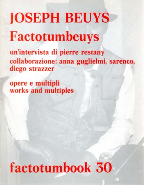 Beuys, Joseph: Factotumbeuys. Un´intervista di Pierre Restany. Collaborazione Anna Guglielmi, Sarenco, Diego Strazzer. Opere e Multipli / Works and Multiples. Erste Auflage. Verona. Edizioni Factotum Art. 1981. 26,8 x 20,9 cm.. 120 unpaginierte S. Illustrierter OKarton. Einband etwas angestaubt und nachgedunkelt. Sonst noch gutes Exemplar. factotumbook 30. Durchgehend mit schwarz-weißen Abbildungen versehen. Enthält ein Interview zwischen Restany und Beuys in Italienisch und Englisch.