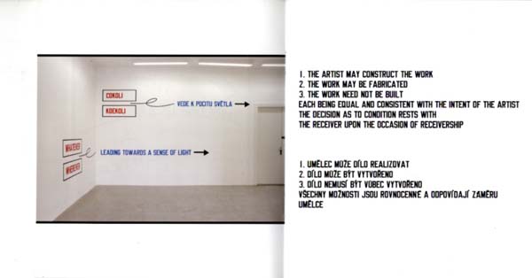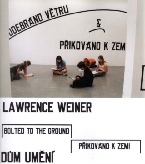 Weiner, Lawrence: BOLTED TO THE GROUND. PRIKOVANO K ZEMI. DUM UMENI. Erste Auflage. Ceske Budejovice. Dum umeni / House of Art. 2010. 18 x 16 cm. [4] unpaginierte Blätter. Klammergehefteter, illustrierter OKarton. Sehr gutes Exemplar. Durchgehend mit meist farbigen Abbildungen versehen. Die Textarbeiten Weiners und Ausstellungsansichten in farbigem Foliendruck auf glattem, weißen Papier. Katalog zur gleichnamigen Ausstellung in Ceske Budejovice, vom 20. Mai bis zum 19. Juni 2010.