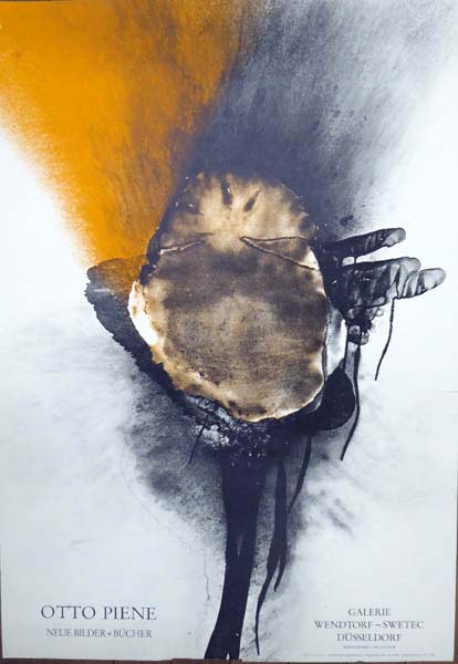 Piene, Otto: Neue Bilder + Bücher. Galerie Wendtorf-Swetec Düsseldorf. 2.11.73 – 31.1.74. Erste Auflage. Düsseldorf. Galerie Wendtorf-Swetec. 1973. 98,5 x 68,9 cm. [1] unpaginierte S. Kleine Fehlstelle mittig unten, kleine Einrisse an der rechten und linken Seite, sonst ordentliches Exemplar. Plakat (Hochformat) auf leichtem Karton zur Ausstellung „Otto Piene. Neue Bilder + Bücher“ in der Düsseldorfer Galerie Wendtorf-Swetec, vom 2. November 1973 bis zum 31. Januar 1974. Recto eine Farbabbildung nach einer Feuergouache von Piene.