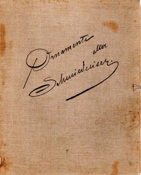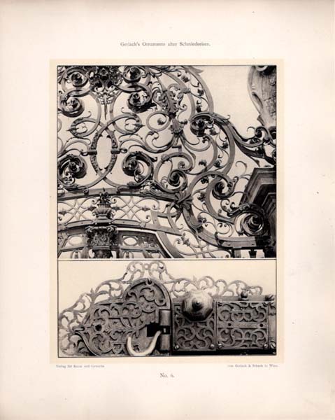 Gerlach, Martin (Herausgeber): Ornamente alter Schmiedeeisen. Photographische Aufnahmen. Zusammengestellt und herausgegeben von Martin Gerlach. 50 Blatt Lichtdrucke im Format von 29 : 36 1/4 CM. Erste Auflage. Wien. Gerlach & Schenk. o. J. [1895]. 36,7 x 29,5 cm. [2] unpaginierte, lose Blätter; 50 paginierte, lose Blätter. OLeinenflügelmappe mit Titelei recto und Schlaufenverschluss. Mappe angeschmutzt, berieben und etwas stockfleckig. Innen nachgedunkelt, angestaubt und randläsurig. Sonst ordentliches Exemplar. Durchgehend mit 50 schwarz-weißen Abbildungen von dekorativ-vegetabilen, schmiedeeisernen Balkon- und Treppenelementen auf getöntem Papier, auf Karton aufgezogen, versehen. Kartonblätter lose in Mappe eingelegt.
