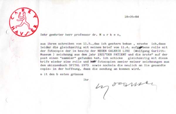 Hauser, Carry [d. i. Carl Maria Hauser]: Maschinenschriftliches Anschreiben. Wien. 1984. 15 x 21 cm. [1] unpaginiertes Blatt. Linksseitig gelocht. Sonst gutes Exemplar. Maschinenschriftliches Anschreiben des österreichischen Malers und Schriftstellers Carry Hauser mit dessen handschriftlicher Signatur. Oben links mit seinem Stempel versehen.