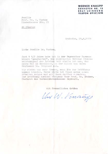 Knaupp, Werner: Maschinenschriftliches Anschreiben. Leinburg. 1979. DIN-A-4. [1] unpaginiertes Blatt. Brief zweifach gefaltet. Sonst gutes Exemplar. Maschinenschriftliches Anschreiben des deutschen Künstlers Werner Knaupp (*1936) mit dessen eigenhändiger Signatur. Beiliegend eine kopierte Einladung zu einer Ausstellung Knaupps in der Rheinischen Landesklinik zu Köln, auf die Knaupp im Schreiben Bezug nimmt.