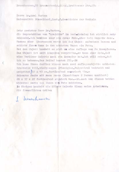 Neuenhausen, Siegfried: Maschinenschriftliches Anschreiben. Braunschweig. Staatliche Hochschule für Bildende Kunst. 1971. DIN-A-4. [1] unpaginiertes Blatt. Links gelocht. Zweifach gefaltet und etwas nachgedunkelt. Sonst gutes Exemplar. Maschinenschriftliches Anschreiben des deutschen Künstlers Siegfried Neuenhausen (*1931) an den deutschen Kunsthistoriker und Sammler Axel Murken, mit eigenhändiger Signatur. Beiliegend ein geöffneter, postalisch gelaufener Briefumschlag mit einer handschriftlichen Adressierung an Murken.