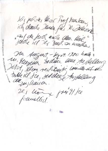 Wölfl, VA [d. i. Volkhart Armin]: Handschriftlicher Brief. Essen. 1984. DIN-A-4. [1] unpaginiertes Blatt. Papier gefaltet, unregelmäßig beschnitten und etwas knittrrig. Sonst guter Zustand. Handschriftlicher Brief des deutschen Aktionskünstlers VA Wölfl (*1943) auf gedrucktem Briefpapier an Axel Murken nebst Signatur. Beiliegend ein vom Künstler handschriftlich adressierter, postalisch gelaufener Briefumschlag.