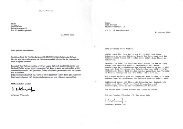 Wohnseifer, Johannes: Zwei maschinenschriftliche Anschreiben und eine Postkarte. o. O. [Erftstadt]. 1998. DIN-A-4. [2] unpaginierte Blätter; [1] unpaginiertes Blatt. 1 Brief gelocht, sonst sehr guter Zustand. Zwei maschinenchriftliche, handsignierte Anschreiben des deutschen Künstlers Johannes Wohnseifer (*1967) an Axel Murken, in dem er Auskunft über sein Verhältnis zur Rezeption von Werken Gerhard Richters erteilt. Beiliegend eine postalisch ungelaufene Postkarte mit einem Motiv von Wohnseifer, mit einem 10-zeiligen Text nebst Signatur in schwarzem Kugelschreiber.