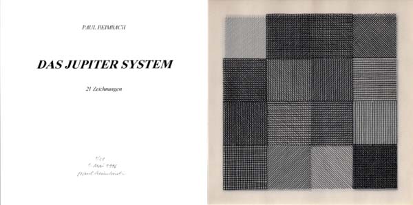 Heimbach, Paul: Das Jupiter System. 21 Zeichnungen. Erste Auflage. Köln. o. V. [Selbstverlag]. 1995. 21,6 x 22,1 cm. [22] unpaginierte Blätter. OKartonfolder mit OKartonumschlag. Papierbedingt etwas nachgedunkelt und wenig angestaubt, sonst gutes Exemplar. Künstlerbuch von Paul Heimbach (1946 – 2013) bestehend aus einer Sammlung von 21 schwarzweissen Kopien von Zeichnungen auf Transparentpapier sowie einer Originaltuschzeichnung, ebenfalls auf Transparentpapier, in einer Mappe. Titelblatt vom Künstler in Bleistift signiert, datiert und nummeriert. Die Tuschezeichnung ebenfalls vom Künstler in Bleistift signiert und datiert (″10.4.95“). Eines von 21 Exemplaren, hier Exemplar Nr. 1/12. [Vgl. Paul Heimbach: Werkverzeichnis der Bücher und Auflagenobjekte. Books & Editions 1967 – 2008. Catalogue Raisonné. Köln 2009, S. 46 (dort abgebildet)].