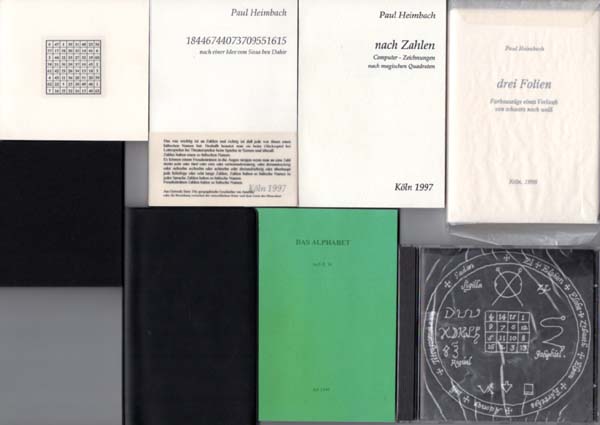 Heimbach, Paul: Musterkoffer. Erste Auflage. Köln. o. V. [Selbstverlag]. 2000. 21,9 x 30,8 x 5 cm (Koffer); verschiedene Größen. 158 S., [4] unpaginierte S.; [14] unpaginierte Blätter; [13] unpaginierte S.; 64 Blätter; [36] unpaginierte Doppelblätter; [10] unpaginierte Blätter, [1] unpaginiertes Blatt; [36] unpaginierte Blätter, [4] unpaginierte Blätter; [17] Doppelblätter; [20] unpaginierte Blätter; [20] unpaginierte Blätter; [10] unpaginierte Blätter; [5] unpaginierte Blätter; ca. [100] Papierstreifen. Verschiedene Einbände, zumeist OKarton mit Titelei; CD-Jewelcase. Gutes bis sehr gutes Exemplar. Künstlerbuchkonvolut von Paul Heimbach (1946 – 2013) bestehend aus einer Sammlung von 12 Künstlerbüchern und Buchobjekten in einem Plexiglaskoffer, entstanden zwischen 1989 und 2000. Vom Künstler zumeist in Bleistift signiert, datiert und nummeriert. Eines von 12 Exemplaren der Musterkofferedition, Buchobjekte in unterschiedlichen Auflagen. [Vgl. Paul Heimbach: Werkverzeichnis der Bücher und Auflagenobjekte. Books & Editions 1967 – 2008. Catalogue Raisonné. Köln 2009, S. 51 (dort abgebildet)].