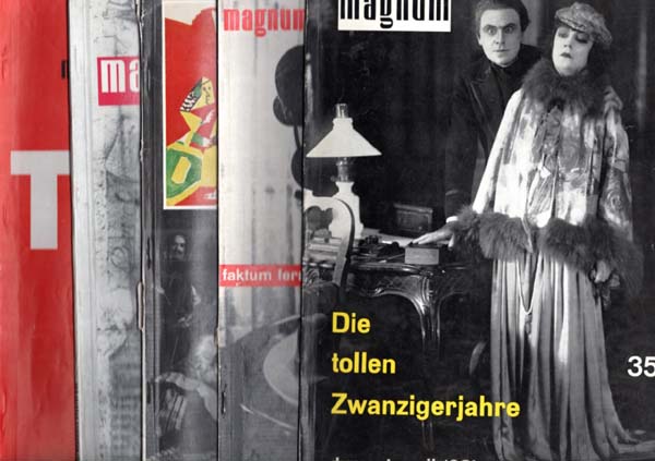 magnum. Die Zeitschrift für das moderne Leben. [Konvolut von 54 Heften]. Erste Auflagen. 54 Hefte. Wien / Frankfurt am Main / Köln. Magnum-Verlag / Verlag DuMont Schauberg. 1955 – 1966. 33 x 24 cm. Jeweils ca. 95 S.; insgesamt ca. 3200 S. Illustrierte OBroschuren. Hefte teilweise berieben, angestaubt, nachgedunkelt und mit kleinen Einrissen. Einzelne Titel mit Archiv- oder Exlibrisstempel. Sonst ordentliche bis gute Exemplare. Durchgehend mit meist farbigen Abbildungen versehen. „Das großformatige Magazin vereinte Beiträge namhafter Schriftsteller, Politologen und Künstler mit Reportagen wichtiger Fotografen der Zeit. Berichtet wurde aus Bereichen der Politik, des Theaters, des Films, der Fotografie sowie insgesamt zur Kultur der 1950er und 60er Jahre. Die Fotos hatten einen hohen Kunst- und Dokumentarwert. Die letzte Nummer 59 erschien im November 1966. Herausgeber waren Klotilde Gassner; ab Nr. 6 Karl H. Pawek; ab Nr. 29: Alfred Neven DuMont. Chefredakteur war Karel H. Pawek, leitender Fotograf war Franz Hubmann. Erschienen ist magnum Nr. 1 in Wien, Nrn. 2-5 in Wien und Frankfurt am Main, Nrn. 6-12 nur in Frankfurt und ab Nr. 13 von 1957-1966 in Köln bei M. DuMont Schauberg“ (Wikipedia). Fotografien u. a. von Robert Capa, Henri Cartier-Bresson, Lucien Clergue und Andreas Feininger waren abgedruckt. Vorhanden sind die Hefte 7 bis 59 komplett, dazu das Heft 5 sowie das Sonderheft „Woher / wohin. Bilanz der Bundesrepublik“ aus dem Jahre 1961. Es fehlen Heft 1 bis 4 sowie das Heft 6, sonst komplett mit dem Sonderheft.