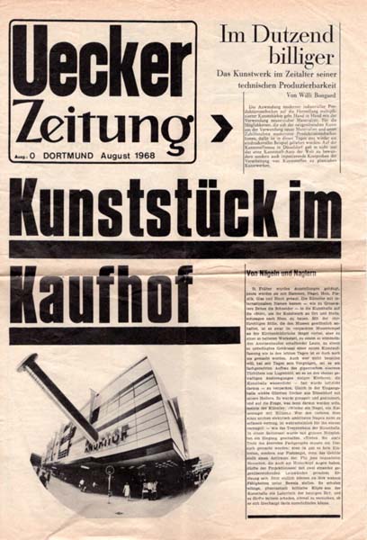 Uecker, Günther: Uecker Zeitung Nummer 0 – 9. Ausgabe 0, August 1968 – Ausgabe 9, 1982 (+ 11 / 2015). 1. Auflage. 10 Hefte. Düsseldorf. Selbstverlag. 1968 – 1982. 34,7 x 27,7 cm und 48,2 x 32,2 cm. Jeweils 4 – 14 unpaginierte S.; (Nr.11) 20 S. OBroschur im Zeitungsformat. Teils gering nachgedunkelt oder leicht angestaubt. 3 Exemplare mittig ein mal leicht gefaltet. Insgesamt sehr gutes Exemplar. Abgesehen von der fehlenden Nummer 10 vollständige Reihe der von Günther Uecker ab 1968 herausgegebenen „Uecker-Zeitung“ inklusive der recht seltenen Null-Nummer vom August 1968 zu „Kunststücke im Kaufhof“. Enthält überwiegend Texte und Interviews sowie Fotos von Arbeiten, Performances und Aktionen Ueckers, teils aber auch im Zusammenhang mit seinen Studenten. Enthält: Nummer 0/68, 4 S. [Vgl. Uecker. Opus Liber, S. 62-63]; Nr. 1/69, 8 S. [Vgl. Uecker. OL, S. 68-69]; Nr. 2/70, 10 S. [Vgl. Uecker. OL, S. 92-93]; Nr. 3/71-72, 12 S. [Vgl. Uecker. OL, S. 100-101]; Nr. 4/73-74, 12 S. [Vgl. Uecker. OL, S. 104-105]; Nr. 5/75-76, 12 S. [Vgl. Uecker. OL, S. 168-169]; Nr. 6/77-78 (EXTRABLATT) 6 S. [Vgl. Uecker. OL, S. 192-193]; Nr. 7/78, 14 S. [Vgl. Uecker. OL, S. 194-195]; Nr. 8/81, 8 S. [Vgl. Uecker. OL, S. 262-263]; Nr. 9/82, 16 S. [Vgl. Uecker. OL, S. 278-279. Beiliegend die Nummer 11 / 2015, die anläßlich der großen Retrospektive Ueckers in der Kunstsammlung Nordrhein Westfalen erschien. Es fehlt die Nummer Nr. 10/1983, 4 S. Sonderausgabe Goslar. So umfangreich eher selten.