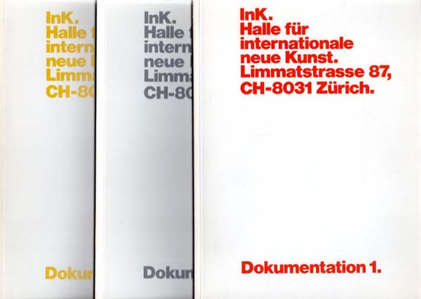 Sauer, Christel (Herausgeberin): InK. Halle für international neue Kunst. Limmatstrasse 87, CH-8031 Zürich. Dokumentation 1 – 8. Information. Erste Auflage. 9 Bände. Zürich. Halle für international neue Kunst. 1978 – 1981. 25 x 19 cm. [59], 52, 69, 67, 77, 51, 55, 77, [20] S. Illustrierte OKartonbände. Einbände teilweise etwas lichtrandig und nachgedunkelt. Sonst gute bis sehr gute Exemplare. Durchgehend mit schwarz-weißen Abbildungen versehen. Ausstellungsdokumentationen, bestehend aus acht kartonierten Bänden sowie einem Informationsheft der 1978 von Urs Raussmüller gegründeten Halle für internationale neue Kunst in Zürich an der Limmatstrasse. Gezeigt wurden die wichtigsten Künstlerinnen und Künstler der damaligen Avantgarde, darunter A. R. Penck, Robert Ryman, Sol Lewitt, Jannis Kounellis, Georg Baselitz, Richard Long, Lawrence Weiner, Bruce Nauman, Gerhard Richter, Lothar Baumgarten, Bernd und Hilla Becher, Robert Mangold, Sigmar Polke, Blinky Palermo, Donald Judd, Gilbert & George, Joseph Beuys, Marcel Broodthaers, Daniel Buren, Hans Peter Feldmann, Martin Disler, Robert Barry, Douglas Huebler, Jan Dibbets, Hanne Darboven, John Baldessari, Giulio Paolini, Ed Ruscha, Bruce McLean, Mario Merz, Gerhard Merz, Wolfgang Laib, Carl Andre und Dan Flavin.