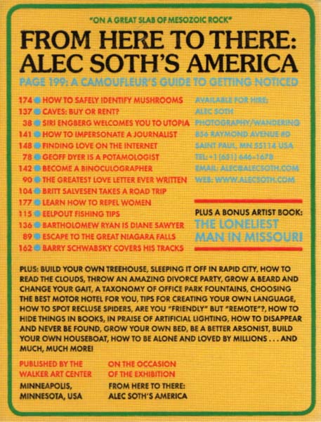 Soth, Alec – Siri Engberg (Herausgeberin): From here to there: Alec Soth’s America. Erste Auflage. Minneapolis. Walker Art Center. 2010. 25,8 x 20,8 cm. 224 S.; [24] unpaginierte Blätter. Illustrierter OLeinenband mit verso montierter Farbabbildung; OBroschur. Am Vorsatz unten rechts zur Stoßkante hin ein Papierabrieb von offenbar entferntem Preisetikett, Kanten minimalst berieben, sonst sehr gutes Exemplar. Durchgehend mit meist farbigen Abbildungen versehen. Katalogbuch zur gleichnahmigen Ausstellung des amerikanischen Fotografen im Walker Art Center, Minneapolis, Minnesota, vom 12. September 2010 bis zum 2. Januar 2011; beiliegend in Einsteklasche auf dem hinteren Innendeckel das Künstlerbuch „The loneliest man in Missouri“.