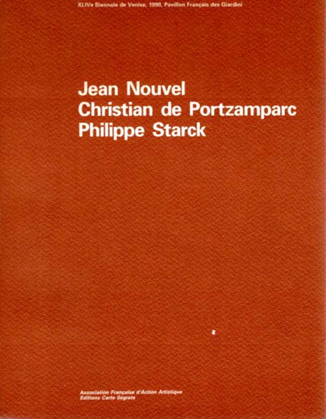 Jean Nouvel – Christian de Portzamparc – Philippe Starck. Du 27 mai au 30 septembre 1990 Pavillon Français des Giardini XLIVe Biennale de Venise. Erste Auflage. Paris / Rom. Association Française d’Action Artistique – Editions Carte Segrete. 1990. 27 x 21 cm. 142 S.; [3] unpaginierte Blätter. OKarton. Rücken aufgehellt, Einband minimalst berieben und angestaubt. Sonst gutes Exemplar. Durchgehend mit meist farbigen Abbildungen von Architekturskizzen, Designstudien, Modellen, Fotografien von ausgeführten Entwürfen der drei französischen Stardesigner – anläßlich der Architekturbiennale in Venedig – versehen.