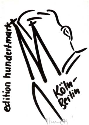 Blume, Bernhard Johannes – Armin Hundertmark (Herausgeber): Köln-Berlin. edition hundertmark. Erste Auflage. Köln. Edition Hundertmark. o. J. [1979]. 14,8 x 10,6 cm. [1] unpaginiertes Blatt. Sehr gutes Exemplar. Postalisch ungelaufene Karte Benhrad Johannes Blumes für die Kölner Edition Hundertmark mit einer schwarzweißen Abbildung nach einer Zeichnung des Künstlers recto. Von Blume in Bleistift unterhalb des Bildmotives in Bleistift signiert und datiert.