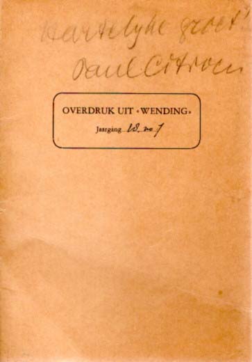 Citroen, Paul: Appel of Citroen door Paul Citroen. Overdruk uit „Wending“. Jaargang 28, no. 1. Erste Auflage. o. O. o. V. 1963. 18 x 12,6 cm. 12 S. [S. 494 – 505]. OBroschur. Einband berieben, nachgedunkelt und angestaubt. Erstes und letztes Blatt vom Autoren mit dem Umschlag verklebt. Sonst ordentliches Exemplar. Mit einer schwarzweißen und einer farbigen Abbildung nach Arbeiten von Karel Appel und Paul Citroen. Text in niederländischer Sprache. Handexemplar von Paul Citroen mit dessen eigenhändigen Korrekturen sowie einem zweizeiligen Gruß (″Hartelyke groet! Paul Citroen“) auf dem vorderen Umschlag in Bleistift