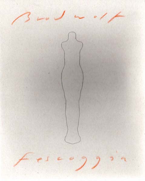 Brodwolf, Jürgen: Magia figura. Mito spazio. Installazioni. Sosta d’Arte, Convento di Fescoggia, Malcantone/Ticino. 9 Settembre – 28 Ottobre 2000. Magie Figur. Mythos Raum. Installationen im Kloster Fescoggia, Malcantone/Tessin. 9. September – 28. Oktober 2000. Erste Auflage. Fescoggia (Schweiz). Sosta d’Arte. 2000. 26,6 x 22 cm. [10] unpaginierte Doppelbögen. OPappfolder mit Ausstanzung recto. Sehr gutes Exemplar. Durchgehend mit meist farbigen Abbildungen versehen. Mit einem Text in deutscher und italienischer Sprache von Luca M. Venturi von und zu Baklanoff. Mit Fotografien von Bernhard Strauss. Katalog zur gleichnamigen Ausstellung im schweizerischen Fescoggia. Titelei auf dem Folder in orange Farbstift handschriftlich von Brodwolf ergänzt. Innen in Bleistift signiert und datiert.
