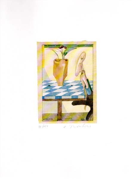 Thomkins, André: „nature morte versatile“. „portrait versatile“. [Farbige Offsetithographie]. o. O. o. V. Nach 1974. 36 x 27 cm (Blattmass); 16,4 x 11,8 cm (Bildmotiv). Sehr gutes Exemplar. Originale, farbige Offsetlithographie, Nummer 57 von 150 nummerierten und handschriftlich mit Bleistift signierten Exemplaren. Wohl späterer Offset-Abzug der 1974 in 100 signierten und nummerierten Exemplaren nach einer Vorlage von 1966 entstandenen Offsetlithografie (Vgl. Thomkins: Die Druckgrafik und Monotypisches / Nr. 129).