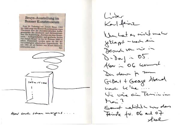 Heil, Axel: Klappkarte des Klinikum Karlsbad-Langensteinbachs mit einer Farbabbildung. Karlsbad. Klinikum Karlsbad-Langensteinbach. 2006. 20,6 x 14,9 cm. [1] unpaginiertes Blatt. Karte minimalst fleckig, sonst gutes bis sehr gutes Exemplar. Zweiteilige Klappkarte des medizinischen Direkturs des Klinikum Karlsbad-Langensteinbach mit einem Motiv nach ainer Arbeit Axel Heils (*1965) recto. Innen vom Künstler mit einem 17-zeiligen handschriftlichen Text nebst einer kleinen Zeichnung, einem montierten Zeitungsausschnitt sowie der Signatur des Künstlers (″Axel“) versehen. Beiliegend der postalisch gelaufene und geöffnete Briefumschlag der Staatlichen Akademie der Künste zu Karlsruhe, der mit einer winzigen Collage Heils versehen wurde. Der Brief war gerichtet an einen befreundeten Düsseldorfer Künstlerkollegen und Kurator.