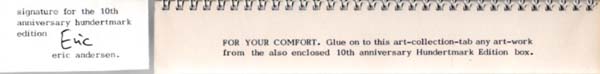 Andersen, Eric: FOR YOUR COMFORT. Glue on to this art-collection-tab any art-work from the also enclosed 10th anniversary Hundertmark Edition box. Erste Auflage. o. O. [Köln]. Edition Hundertmark. 1980. 3,9 x 21 cm. [34] unpaginierte Blätter; [1] unpaginiertes Blatt. OKarton mit Spiralbindung. Papierbedingt leicht nachgedunkelt. Sonst gutes Exemplar. In einer signierten und auf 40 Exemplare limitierten Auflage erschienene Edition des belgischen Fluxus-Künstlers Eric Andersen (*1940) für die Kölner Edition Hundertmark aus dem Jahre 1980. Anläßlich des Erscheinens der Jubiläumsbox zum 10-jährigen Bestehen der Edition Hundertmark publiziert. Die einzelnen, von einer Spiralbindung zusammengehaltenen Seiten sollen nach Anweisung des Künstlers, wie auf jeder Seite vermerkt, auf jedes Kunstwerk der Box geklebt werden. Auf einem beiliegenden Zettel vom Künstler in schwarzem Faserschreiber handsigniert (″Eric“).