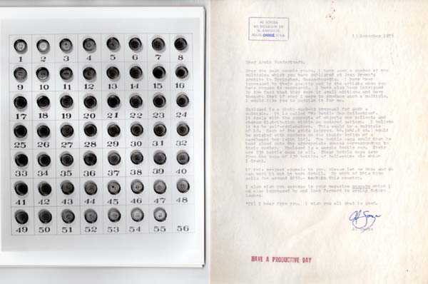 Souza, Al: Bottlecaps. Zehnteilige serielle Arbeit und zwei Seiten Autographen. Amherst (MA). o. V. (Selbstverlag). 1976. 25,3 x 20,3 cm; 28 x 21,7 cm; 4,3 x 5,5 x 1,3 cm. [12] unpaginierte Blätter. Pappumschlag und postalisch gelaufener Briefumschlag. Umschlag berieben, angestaubt und knittrig. Papier etwas angestaubt und nachgedunkelt. Sonst gute Exemplare. Interessantes Konvolut von Arbeiten des amerikanischen Künstlers Al Souza (*1944), bestehend aus einer zehnteiligen seriellen Arbeit sowie einem zweiseitigen, maschinenschriftlichen Anschreiben an den Verleger Armin Hundertmark sowie einem Kronkorken in einem durchsichtigen Plastikkästchen. Die serielle Arbeit zeigt auf 10 schwarzweißen Fotoabzügen eine horizontal und vertikal geordnete Sammlung von Kronkorken, jeweils mit einer Nummerierung versehen, von 1 bis 56. Die einzelnen Kategorien lauten: No.1 My Complete Collection of Bottlecaps; No.2 My 1st Best Set of Doubles; No. 3 My 2nd Best Set of Doubles; No. 4 My 3rd Best Set of Doubles; No. 5 My 4th Best Set of Doubles; No. 6 My 5th Best Set of Doubles; No. 7 My 6th Best Set of Doubles; No. 8 My 7th Best Set of Doubles; No. 9 My 8th Best Set of Doubles; No. 10 My 9th Best Set of Doubles. Jeweils verso nummeriert von 1 bis 10, auf Sticker betitelt und jeweils mit dem Stempel des Künstlers versehen. Gekennzeichnet „Work Print“. Im Anschreiben stellt Souza seine Arbeit dem Verleger vor und schlägt eine Kooperation im Rahmen der Edition Hundertmark vor. Das Schreiben vom Künstler handsigniert. Auf der zweiten Seite eine Ausstellungsübersicht des Künstlers. Beiliegend eine der originalen Bottlecaps. Eine Edition kam nie zustande. Seltenes Dokument künstlerischer Selbstpromotion. Texte in englischer Sprache.