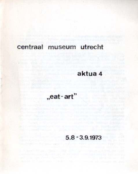 Spoerri, Daniel: „eat-art“. centraal museum utrecht. aktua 4. 5.8.-3.9.1973. Erste Auflage. Utrecht. Centraal Museum. 1973. 21,5 x 17 cm. 8 S. Klammergeheftete OBroschur. Papierbedingt etwas nachgedunkelt und lichtspurig. Sonst noch gutes Exemplar. aktua 4. Sehr schlichter Katalog ohne Abbildungen zu einer Eat-Art Ausstellung im Utrechter Centraal Museum im Jahre 1978 mit Werken von Arman, Bury, Gerstner, Lichtenstein, Luginbühl, Morellet, Rot, Spoerri, Thomkins, Weseler, Wewerka u. a. Mit einem kurzen Text in niederländischer Sprache.