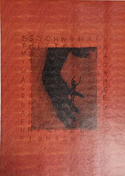 Polke, Sigmar: Figur mit Hand (Es schwindelt…) Hamburg. Griffelkunst-Vereinigung. 1973. 62,5 x 45,5 cm. Sehr gutes Exemplar. Einer von sehr wenigen Probedrucken dieser Polke-Edition für die Griffelkunst-Vereinigung, 1973. Unsignierter Andruck mit der ornamentalen Schrift. Offsetdruck in Schwarz auf braunrotem Papier mit Eidechsendesign [Zur Original-Edition vgl. Becker / von der Osten. Polke – Die Editionen, Nr. 32, S. 97/98, mit Abbildung]. Provenienz: Sammlung Prof. Carl Vogel (mit dessen Stempel verso).