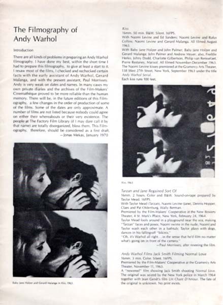 (Warhol, Andy) – Jonas Mekas: The Filmography of Andy Warhol. Erste Auflage. o. O. o. V. [Privatdruck]. 1970. 28,9 x 21,2 cm. [11] unpaginierte S. Illustrierte, klammergeheftete OBroschur. Papier etwas stockfleckig und wenig nachgedunkelt. Sonst noch gutes Exemplar. Durchgehend mit schwarz-weißen Abbildungen versehen. Text in englischer Sprache. Filmografie Andy Warhols mit einigen Stills, erarbeitet und kompiliert von dem litauisch-amerikanischen Avantgarde-Filmregisseur Jonas Mekas (1922 – 2019). Selten!