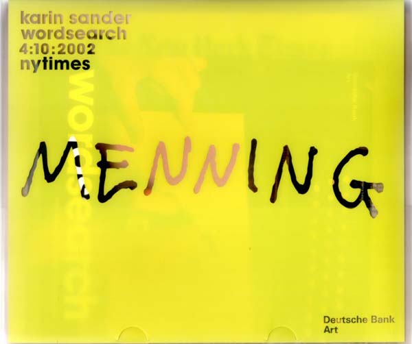 Sander, Karin: wordsearch. 4:11:2002. nytimes. Menning. a translinguistic sculpture by Karin Sander. An Advertising Supplement to the New York Times. Erste Auflage. Frankfurt am Main. Deutsche Bank. 2002. 32,6 x 36 cm. 57 S. Klammergeheftete, illustrierte OBroschur und Zeitungsbroschur in semitransparenter OPlastikbox. Zeitung wie immer nachgedunkelt. Plastikbox minimalst gebrauchsspurig. Sonst gutes bis sehr gutes Exemplar. Moment. Durchgehend mit meist farbigen Abbildungen versehen. Vollständige Print-Ausgabe der New York Times vom 04. Oktober 2002 mit dem 64-seitigen Supplement „wordsearch“ als Edition der deutschen Konzept-Künstlerin Karin Sander. Texte in deutscher und englischer Sprache.