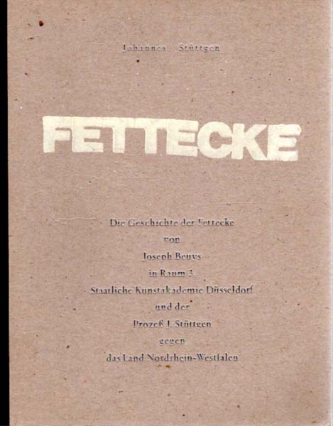 Beuys, Joseph – Johannes Stüttgen: Fettecke. Die Geschichte der Fettecke von Joseph Beuys in Raum 3, Staatliche Kunstakademie Düsseldorf und der Prozeß J. Stüttgen gegen das Land Nordrhein-Westfalen. Erste Ausgabe. Düsseldorf. Edition Achenbach. 1989. 28 x 22 cm. [152] unpaginierte S. OPappe mit Leinenstreifenrücken, Titel „Fettecke“ in weißem Acryl. Sehr gutes Exemplar. Dokumentiert akribisch die Entstehung, Vernichtung und den Prozess um die Beuys´sche Fettecke in der Kunstakademie Düsseldorf. Von Johannes Stüttgen in Bleistift auf dem Vortitel signiert und datiert „1999“.