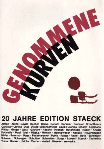 Staeck, Klaus (Herausgeber): Genommene Kurven. 20 Jahre Edition Staeck. Heidelberger Kunstverein, 3. Februar bis 17. März 1985 / Kunstmuseum Düsseldorf, September – Oktober 1985. Erste Auflage. Heidelberg. Edition Staeck. 1985. 30 x 20 cm. 159 S. Illustrierter, glanzkaschierter OKarton. Einband und innen papierbedingt etwas nachgedunkelt. Sonst gutes Exemplar. Dokumentation der Multiple, Postkarten- und Kunsteditionen der Edition Staeck mit Abbildungen zahlreicher Arbeiten. Von Klaus Staeck handschriftlich auf dem Vortitel gewidmet, signiert und datiert in rotem Kugelschreiber.