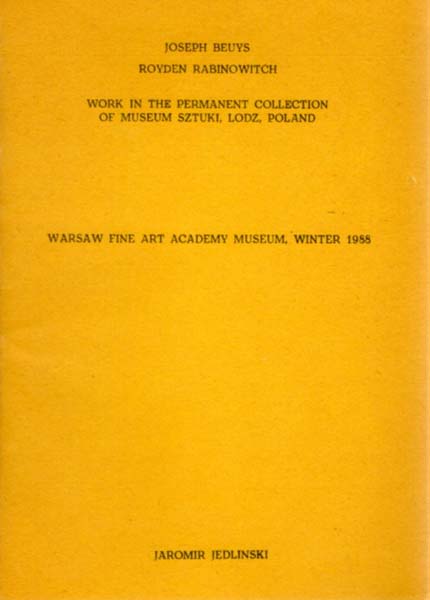 (Beuys, Joseph) – Jaromir Jedlinski (Herausgeber): Joseph Beuys. Royden Rabinowitsch. Work in the permanent collection of Museum Sztuki, Lodz, Poland. Warsaw Fine Art Academy Museum, Winter 1988. Prace z kolekcji muzeum Sztuki w Lodzi. Muzeum Akademii sztuk pieknych. Warszawa, zima 1988. Erste Auflage. Warschau. Muzeum Akademii. 1988 23,8 x 17 cm. [8] Blatt. Klammergehefteter OKarton. Einband und innen papierbedingt etwas nachgedunkelt. Sonst gutes Exemplar. Durchgehend mit schwarz-weißen Abbildungen versehen. Texte in englischer und polnischer Sprache.