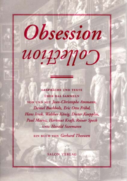 Theewen, Gerhard: Obsession. Collection. Gespräche und Texte über das Sammeln. Von und mit Jean-Christophe Ammann, Daniel Buchholz, Eric Otto Frihd, Hans Irrek, Walther König, Dieter Koepplin, Paul Maenz, Hartmut Kraft, Reiner Speck und Harald Szeemann. Dritte Auflage. Köln. Salon Verlag. 1996. 24 x 17,3 cm. 118 S. Illustrierter OKartonband mit illustriertem OKlappenumschlag. Mit illustriertem, semitransparenten Pergaminumschlag.. Pergaminumschlag etwas nachgedunkelt, sonst gutes Exemplar. Durchgehend mit schwarz-weißen Abbildungen versehen. Einzelband der von Gerhard Theewen, dem Verleger des Kölner Salon-Verlages herausgegebenen, kunstwissenschaftlich orientierten Reihe zu den Themen Sammeln, Archivieren, Ausstellen und Lehren. Mit zahlreichen Essays und künstlerischen Beiträgen ausgewiesener Fachleute, darunter Kuratoren, Galeristen, Kunstwissenschaftlern, Bibliothekare und Künstler.