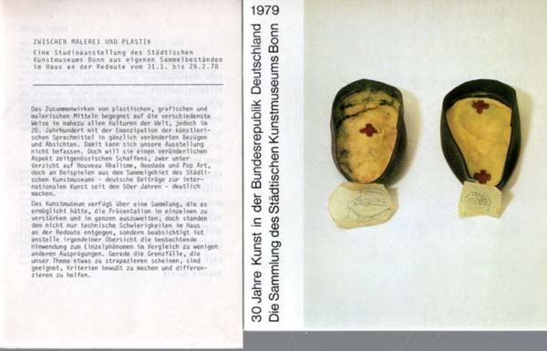 (Beuys, Joseph): 30 Jahre Kunst in der Bundesrepublik Deutschland. Die Sammlung des Städtischen Kunstmuseums Bonn. Auswahl. 23. November 1979-3. Februar 1980. Erste Auflage. Bonn. Städtisches Kunstmuseum Bonn. 1979. 20 x 19 cm. 24 unpaginierte S. Klammergehefteter, illustrierter OKarton. Gutes bis sehr gutes Exemplar. Mit einem Text von Dierk Stemmler und einem Verzeichnis der ausgestellten Kunstwerke. Ohne Abbildungen. Mit mehreren Beilagen: Zeitungsausschnitt zur Ausstellung „25 Kunst in der Bundesrepublik Deutschland“ aus dem Jahre 1974, eine klammergeheftete Broschur mit Texten zur Bonner Ausstellung „Zwischen Malerei und PLastik“ in der Redoute aus dem Jahre 1978, eine hektographierte kurze Textsammlung zur 1974er Ausstellung in Bonn sowie ein maschinenschriftlicher, hektographierter Aufsatz zu Künstlern des Informel sowie Beuys, Palermo, Knoebel und Polke.