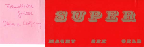 Weber, Wolfgang und Ilona Weber: Eine kleine Oase der Sauberkeit. SUPER. Macht Sex Geld. Oppenheimstudio Köln [Einladungskarte]. Köln. Oppenheimstudio. [ca. 1978]. 21,5 x 10,4 cm. 2 Blatt. Kleine Druckstelle einer Büroklammer. Sonst noch sehr gutes Exemplar. Einladungskarte zu einer Einzelausstellung von Wolfgang und Ilona Weber in der Kölner Galerie Oppenheimstudio im Jahre 1978. Beiliegend ein kleiner rosafarbener Zettel mit einem handschriftlichen Gruß der beiden Künstler.