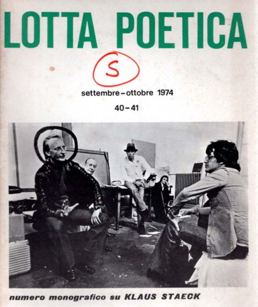 (Staeck, Klaus): Lotta Poetica – Lutte Poetique – Poetische Strijd – Poetischer Kampf – Poetic War – settembre – ottobre 1974. 40 – 41. numero monografico su Klaus Staeck. Erste Auflage. Brescia / Antwerpen. Lotta Poetica. 1974. 24,7 x 20,9 cm. 11 unpaginierte Blatt. Illustrierter, klammergehefteter OKarton. Einband mit privatem „S“ in rotem Filzstift auf Titel. Insgesamt etwas angestaubt, lichtspurig und nachgedunkelt. Sonst noch gutes Exemplar. Durchgehend mit schwarz-weißen Abbildungen nach Plakatarbeiten Klaus Staecks versehen. Texte in deutscher und italienischer Sprache.