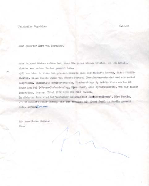 Mayröcker, Friederike: Maschinenschriftliches Anschreiben [Autograph]. [Wien]. o. V. 1980. 29,6 x 21 cm. 1 Blatt. Kuvert berieben, nachgedunkelt und linksseitig gelocht. Blatt minimalst angestaubt, Schrift ganz leicht verblasst. Zum Versand zweimal gefaltet und linksseitig gelocht. Sonst noch guter Zustand. 15-zeiliges, maschinenschriftlichen Anschreiben, auf leichtem Papier, der österreichischen Schriftstellerin Friederike Mayröcker (1924 – 2021) aus dem Jahre 1980 mit der Beantwortung einer Leseranfrage zu den von ihr besprochenen Schallplatten. Von Mayröcker handschriftlich signiert. Beiliegend das postalisch gelaufene und geöffnete Briefkuvert mit dem Adressaufkleber der Schriftstellerin.