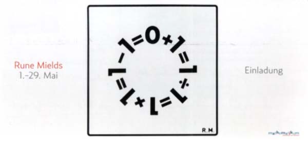 Mields, Rune: Einladung. 1. – 29. Mai. Mathematicum Gießen. Vernissage Sonntag, 1. Mai 2016 [Einladungskarte]. Gießen. Mathematicum. 2016. 9,7 x 20,9 cm. 1 Blatt. Kleine Verschmutzung recto, sonst noch sehr guter Zustand. Postalisch gelaufene Einladungskarte zu einer Vernissage der deutschen Künstlerin Rune Mields (*1935) im Mathematicum zu Gießen. Recto eine Abbildung nach einer typischen formaltypographischen Zahlenarbeit der Künstlerin in Schwarz auf Weiß auf der glanzkaschierten Seite der Postkarte. Verso von der Künstlerin handschriftlich adressiert, gewidmet und signiert.