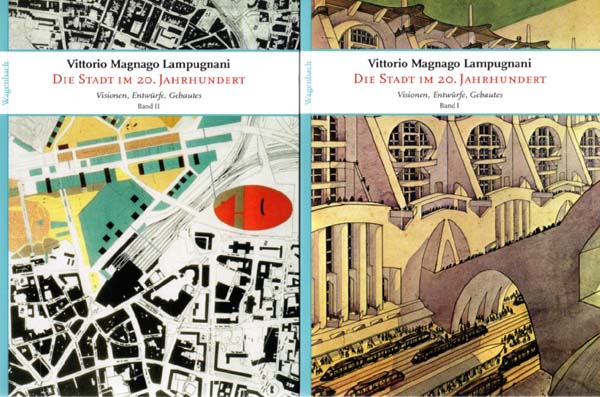 Magnago Lampugnani, Vittorio: Die Stadt im 20. Jahrhundert. Visionen, Entwürfe, Gebautes. Band I / Band II. Erste Auflage dieser Ausgabe. Zwei Bände. Berlin. Verlag Klaus Wagenbach. 2010. 462 S.; 498 S. [Gesamt 960 S.]. Illustrierte OKlappkartonbände in illustriertem OPappschuber. Schuber mit schmalem Papierabrieb und Quetschung auf der Rückseite, sonst sehr gutes Exemplar. Durchgehend mit schwarz-weißen und farbigen Abbildungen versehen.