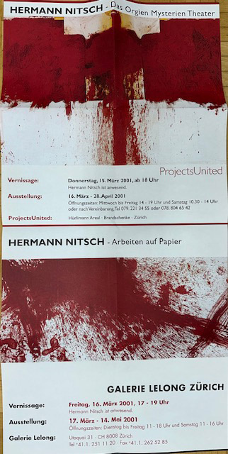 Nitsch, Hermann: Das Orgien Mysterien Theater. Arbeiten auf Papier [Doppeltes Ausstellungsfaltplakat]. Erste Auflage. Zürich. Galerie Lelong / Projects United. 2001. 68 x 33 cm. 1 Blatt. Plakat zweifach für den Versand gefaltet. Sonst sehr gutes Exemplar. Faltplakat zu zwei Einzelausstellung von Hermann Nitsch in der Züricher Galerie Lelong (″Arbeiten auf Papier“) und bei Projects United Zürich (″Das Orgien Mysterien Theater“) aus dem Jahre 2001. Recto eine farbige Abbildung einer Arbeit des Künstlers.