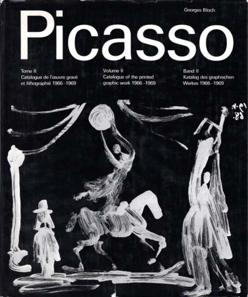 Picasso, Pablo – Georges Bloch: Tome II. Catalogue de l’oeuvre gravé et lithographié 1966 – 1969. Volume II. Catalogue of the printed graphic work 1966 – 1969. Band II. Katalog des graphischen Werkes 1966 – 1969. Zweite Auflage. Bern. Editions Kornfeld et Klipstein. 1977. 30 x 25 cm. 344 S. OLeinen mit illustriertem, glanzkaschiertem OUmschlag. Umschlag mit kleinem Einriss, wenig angestaubt, etwas berieben und randläsurig, Umschlagrücken leicht aufgehellt. Innen minimalst nachgedunkelt. Sonst gutes Exemplar. Der zweite Band des immer noch maßgeblichen Werkverzeichnisses der Druckgrafik Picassos, komplett durchgehend mit meist schwarzweißen Abbildungen versehen. Texte in französischer, englischer und deutscher Sprache. Als Frontispiz befindet sich ein montiertes, farbiges Fotoporträt des Künstlers von Jacqueline Picasso.