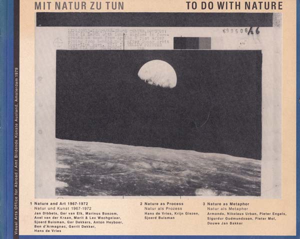 Mit Natur zu tun / To do with Nature. To Do With Nature. Erste Auflage. Amsterdam. Bildende Künste Ausland. 1979. 21 x 26 cm. 64 unpaginierte S. Illustrierter OKarton. Einbandkanten etwas nachgedunkelt und mit kleinen Bereibungen. Sonst gutes Exemplar. Ausstellung Kölnischer Kunstverein (Klebeschild auf dem Vorsatzblatt) 25. 1. bis 9.3. 1980, organisiert von Gerhard von Graevenitz, Piet van Daalen, Jan van Munster und Gijs van Tuyl durchgehend mit Abbildungen versehen. Der Katalog gliedert sich in 3 thematische Abschnitte: 1.) Natur und Kunst 1967 – 1972. 2.) Natur als Prozess. 3.) Natur als Metapher. Text in deutscher und englischer Sprache.